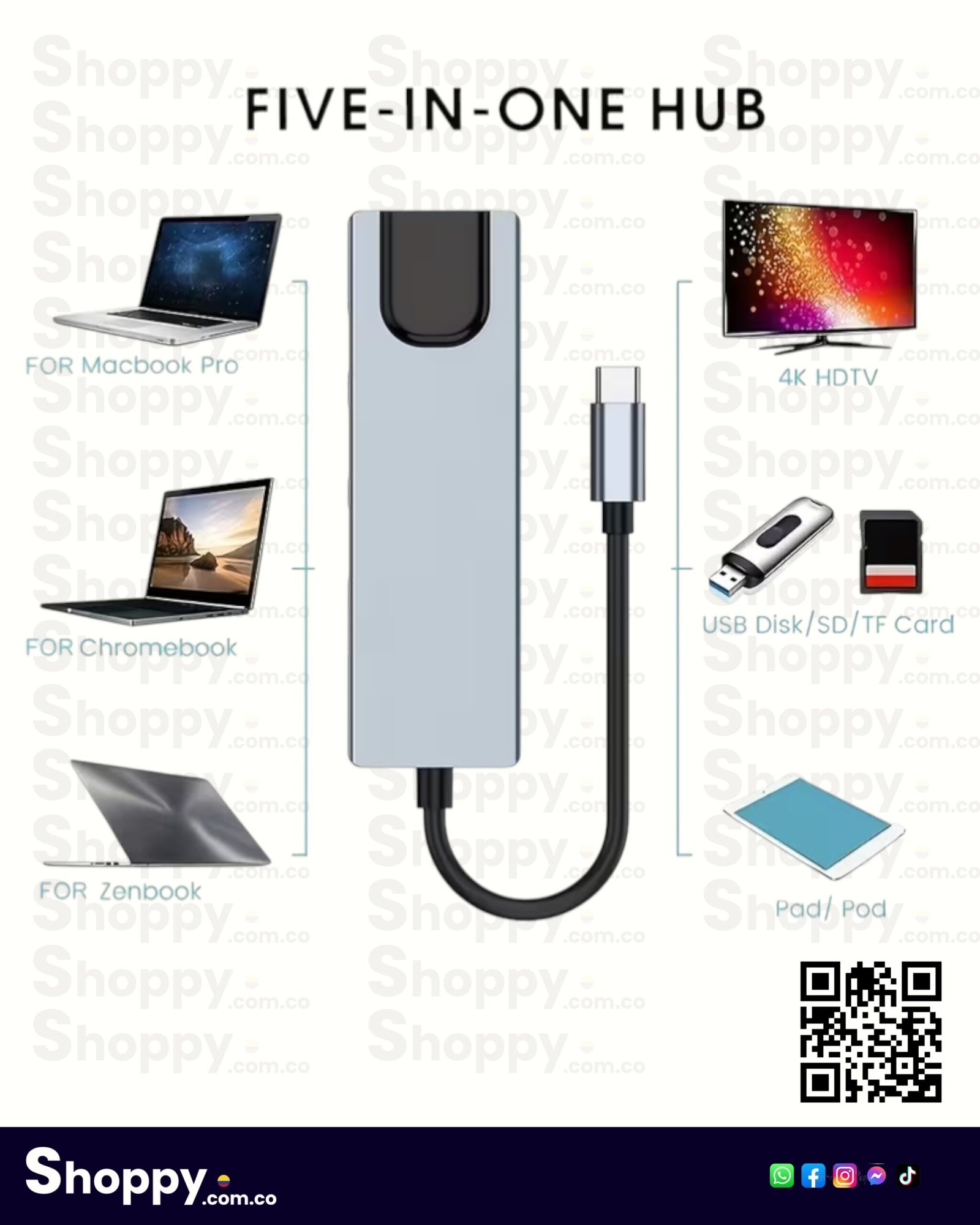 Hub 5 en 1 con salida HDTV 4K, puerto de red RJ45, USB 3.0 de alta velocidad y puerto de carga PD. Compatible con Mac y Windows. Diseño compacto y resistente en aluminio.